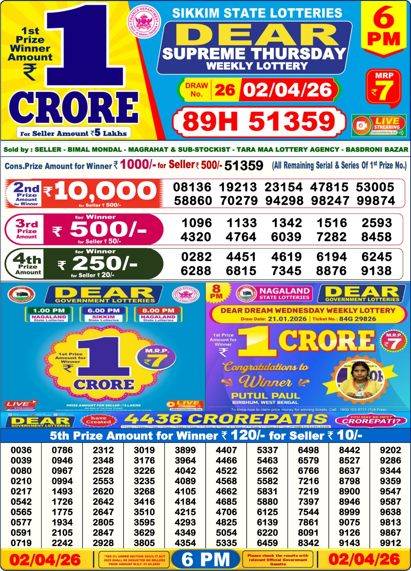 Result Released: The official Result chart for Dear Supreme Weekly Lottery Result 6 PM (02/04/26) is now available below. Good luck!