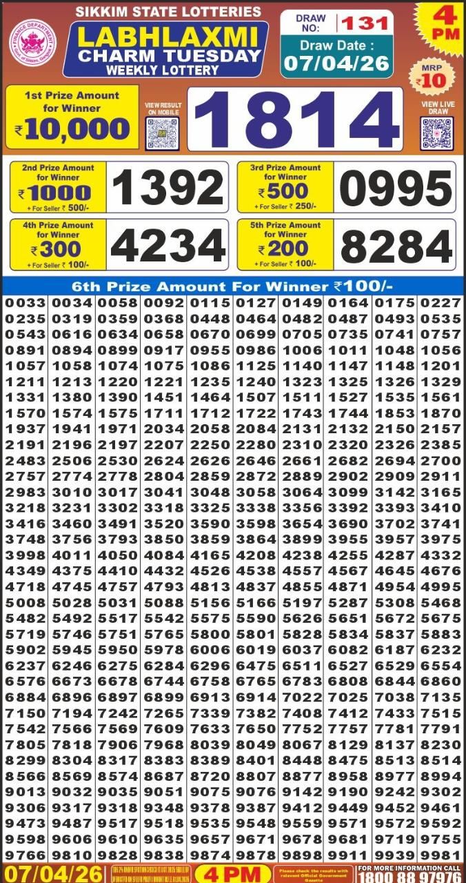 Result Released: The official Result chart for Labh Laxmi Charm Weekly Lottery Result 4 PM (07/04/26) is now available below. Good luck!
