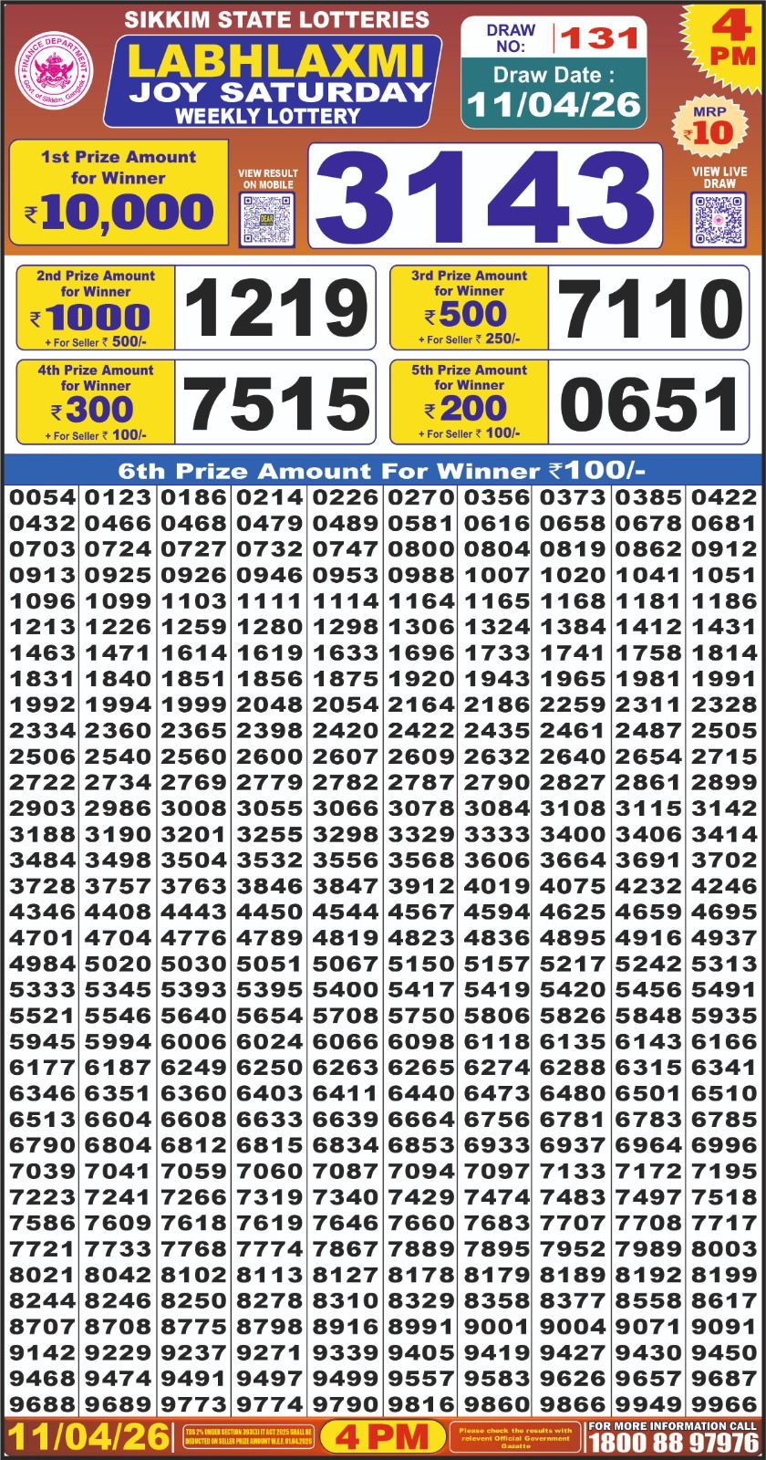 Result Released: The official Result chart for Labh Laxmi Joy Weekly Lottery Result 4 PM (11/04/26) is now available below. Good luck!
