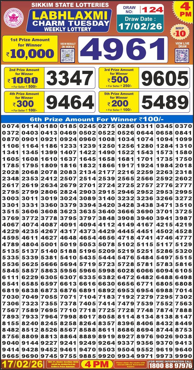 โœ… Result Released: The official Result chart for Labh Laxmi Charm Weekly Lottery Result 4 PM (17/02/26) is now available below. Good luck!