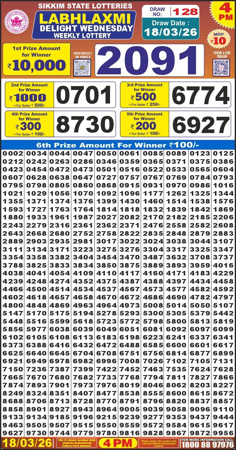 Result Released: The official winning chart for Labh Laxmi Delight Weekly Lottery Result 4 PM (18/03/26) is now available below. Good luck!