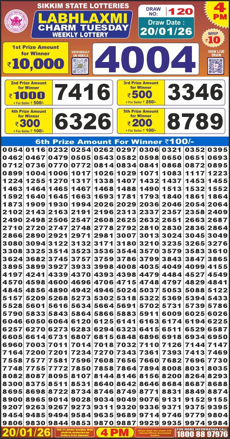 Result Released: The official winning chart for Labh Laxmi Charm Weekly Lottery Result 4 PM (20/01/26) is now available below. Good luck!