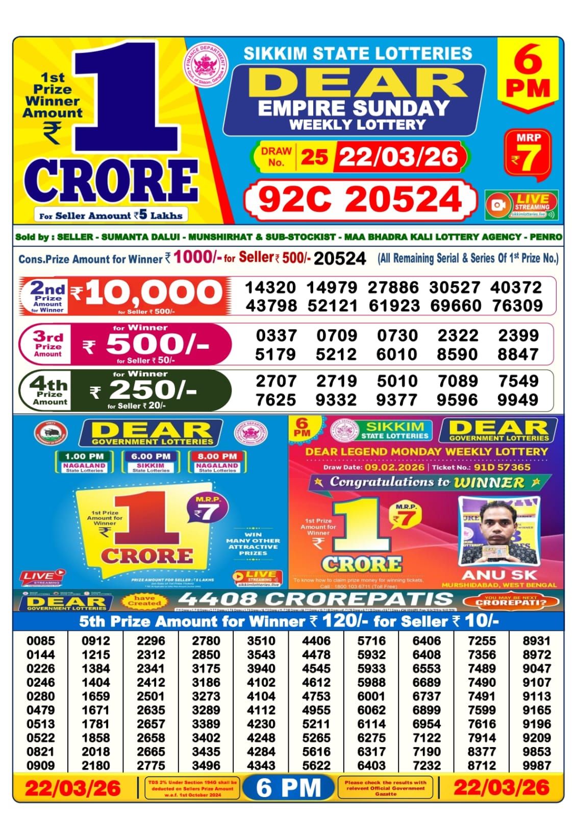 Result Released: The official Result chart for Dear Empire Weekly Lottery Result 6 PM (22/03/26) is now available below. Good luck!