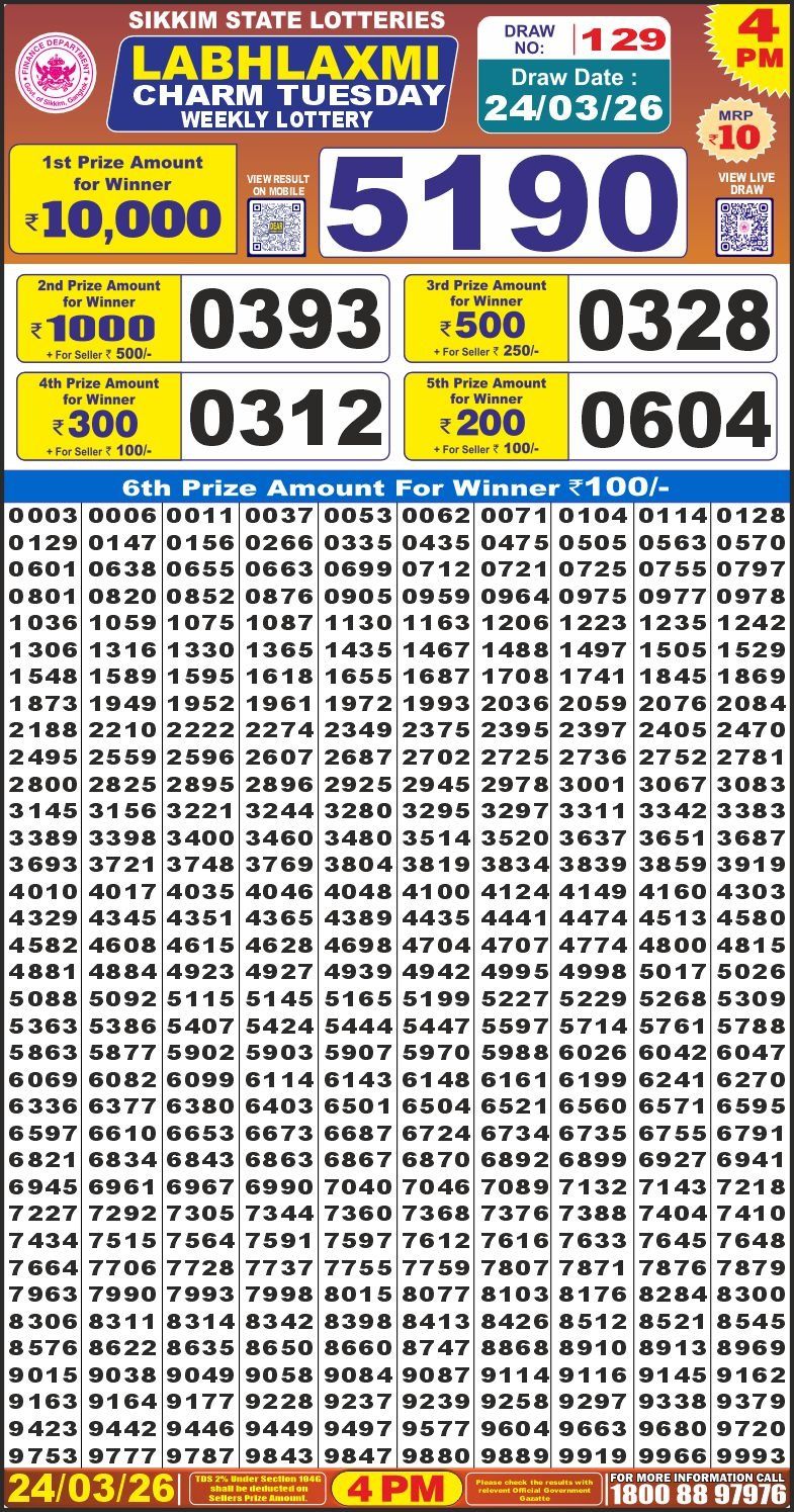 ✅ Result Released: The official Result chart for Labh Laxmi Charm Weekly Lottery Result 4 PM (24/03/26) is now available below. Good luck!