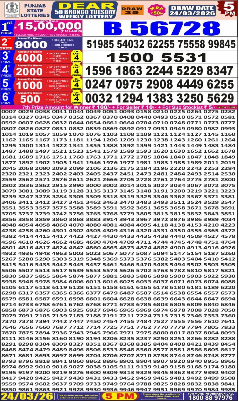 ✅ Result Released: The official Result chart for Punjab State Dear 50 Bronco Weekly Lottery Result 5 PM (24/03/26) is now available below. Good luck!