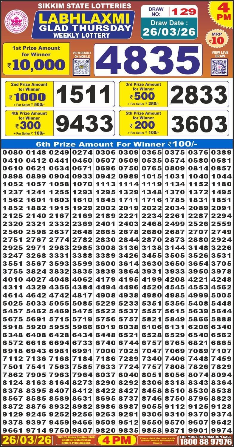 ✅ Result Released: The official Result chart for Labh Laxmi Glad Weekly Lottery Result 4 PM (26/03/26) is now available below. Good luck!