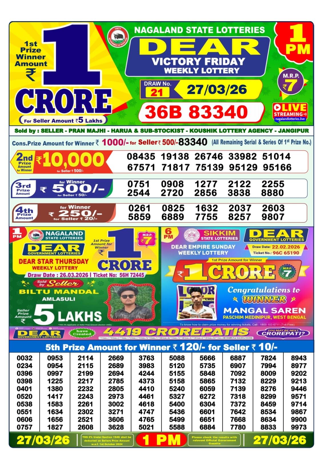 ✅ Result Released: The official Result chart for Punjab State Dear 50 Colt Weekly Lottery Result 5 PM (27/03/26) is now available below. Good luck!