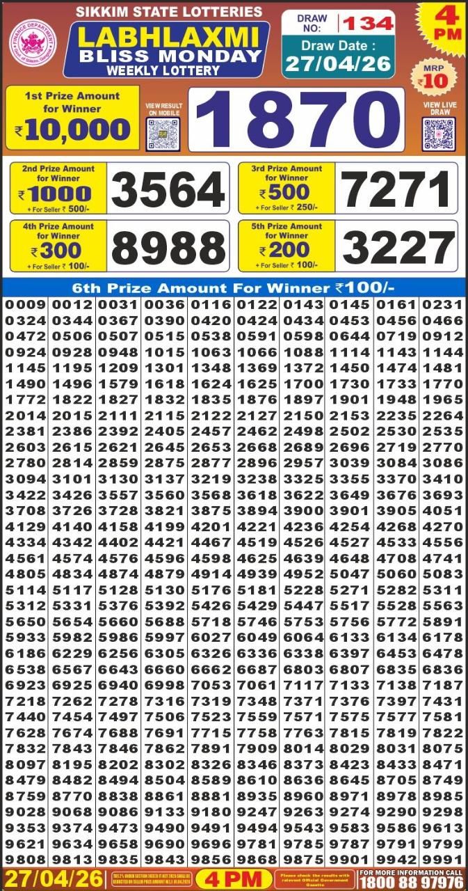 Result Released: The official Result chart for Labh Laxmi Bliss Weekly Lottery Result 4 PM (27/04/26) is now available below. Good luck!