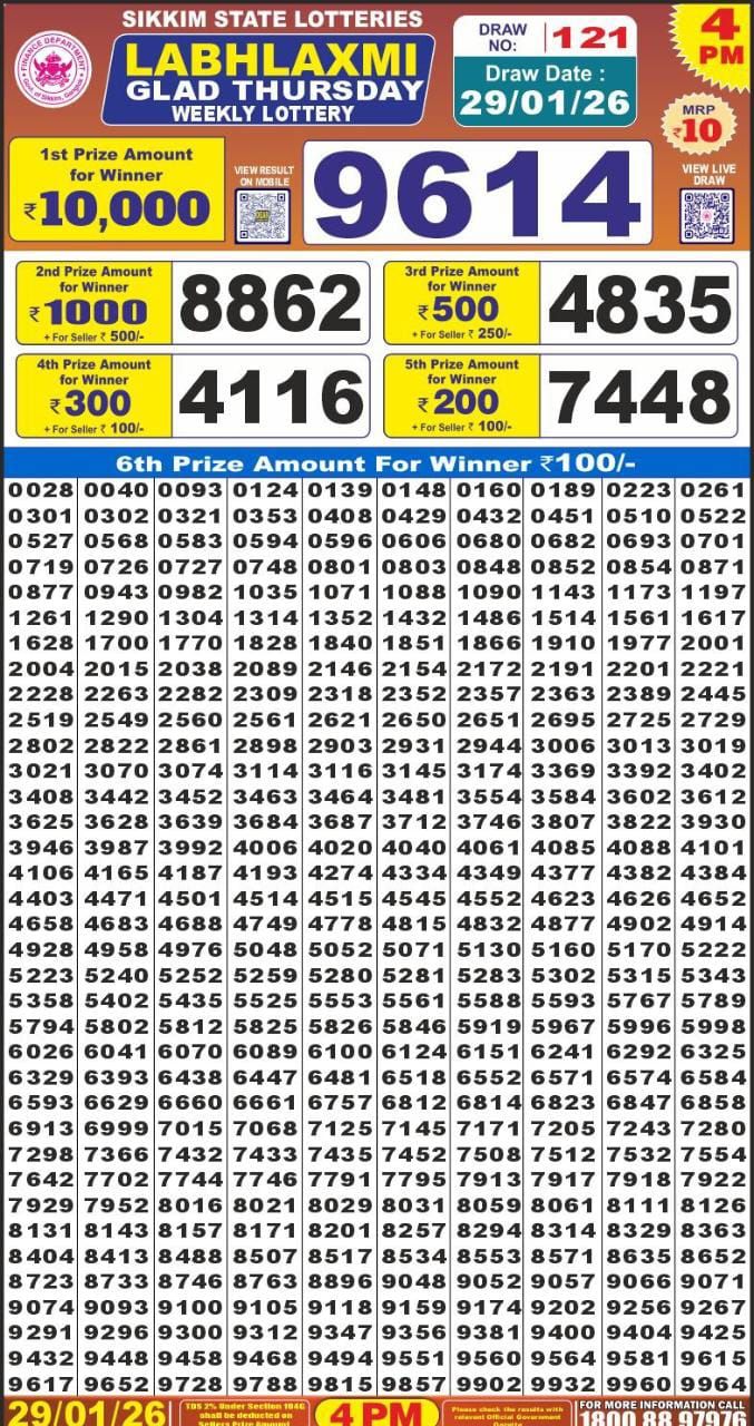 ✅ Result Released: The official winning chart for Labh Laxmi Glad Weekly Lottery Result 4 PM (29/01/26) is now available below. Good luck!